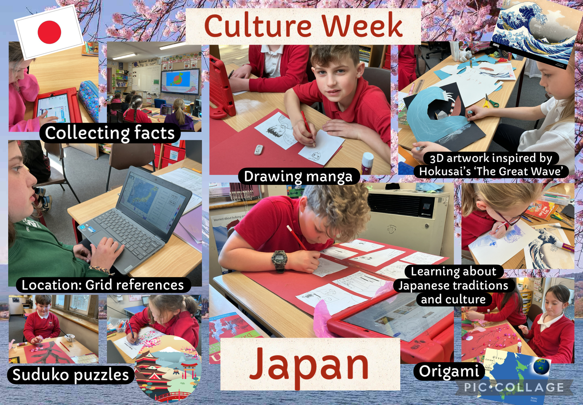 We gathered facts about Japan’s traditions and culture and presented them in a manga-style comic strip. We were inspired by the work of Hokusai’s The Great Wave and used this to create our own artwork.